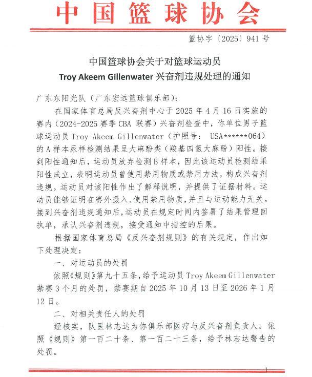 早在六月份的時候,中國反興奮劑中心公布了CBA球員的興奮劑違規(guī)情況,前廣東男籃的外援吉倫沃特在4月16日的賽后檢查中,A樣本檢測呈大麻酚類陽性,且其放棄了檢測B樣本,構成了興奮劑違規(guī),這件事引發(fā)了眾多媒體和球迷的熱議。經過了三個月的調查后,中國籃協(xié)發(fā)布官宣,表示吉倫沃特的事情已經調查清楚,并公布了處罰結果。