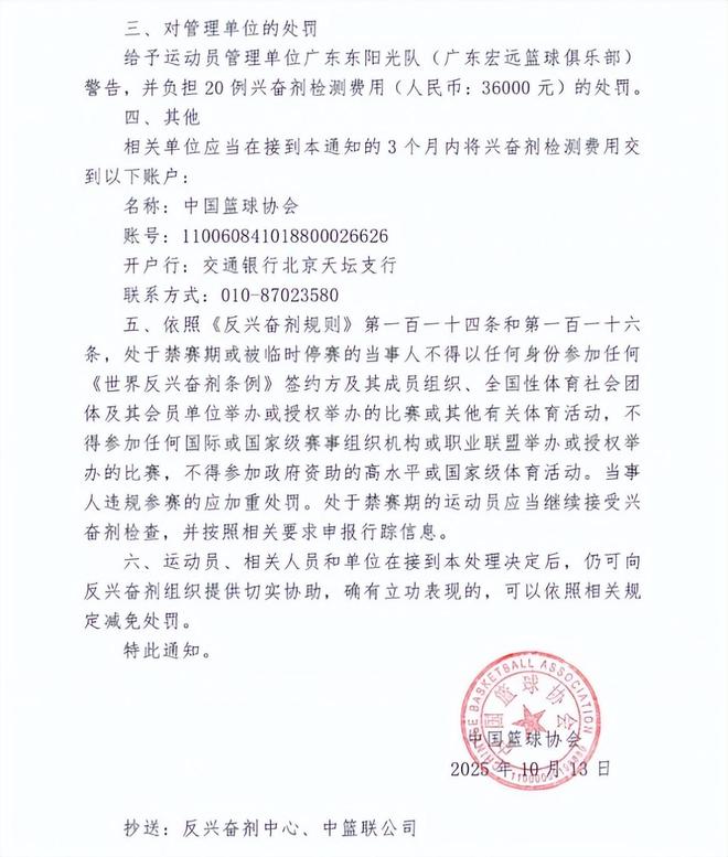按照籃協(xié)公布的消息,在調查過程中,吉倫沃特對檢查結果進行了說明,并提供了相關證據材料,能夠證明其是在賽外攝入、使用禁用物質,與提升運動能力無關。接到興奮劑違規(guī)通知后,吉倫沃特在規(guī)定時間內簽署了結果管理回執(zhí)單,承認興奮劑違規(guī),接受通知中指控的結果。為此籃協(xié)對吉倫沃特做出了禁賽三個月的處罰;隊醫(yī)林志達作為廣東男籃醫(yī)療與反興奮劑負責人,給予警告處分;廣東男籃監(jiān)管方面不到位,被處于警告處分,并承擔20例興奮劑檢測費用36000元。在這則通告的最后,籃協(xié)還有另外一句話,那就是“運動員、相關人員和單位如果能夠向反興奮劑組織提供切實協(xié)助,確有立功表現的,可以依照規(guī)定減免處罰?!?/p>
