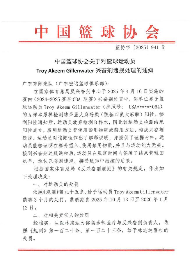 中國籃協(xié):吉倫沃特興奮劑違規(guī)禁賽3個月 廣東男籃承擔(dān)3萬6檢測費(fèi)