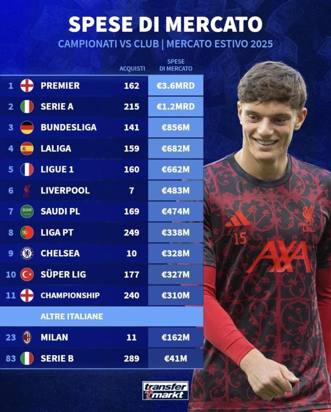 意甲走“量+控本”:引援?dāng)?shù)比英超多(215 vs 162),但總支出僅為三分之一,導(dǎo)致單簽成本顯著更低(558 萬 vs 2222萬歐)。這通常意味著更多免費/低價轉(zhuǎn)會、租借+買斷、以及瞄準(zhǔn)中低價段與潛力股。
