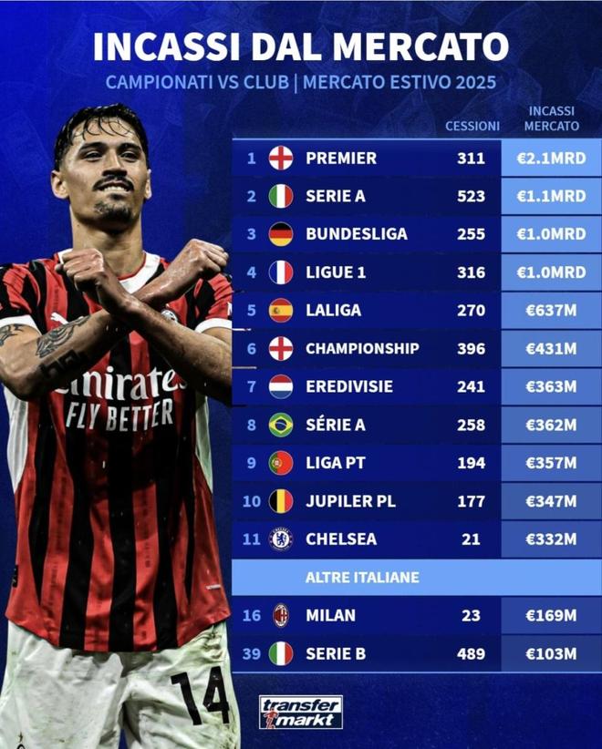 — 意大利其他:AC 米蘭|出售 23|收入 1.69億歐元